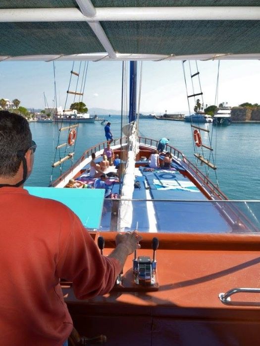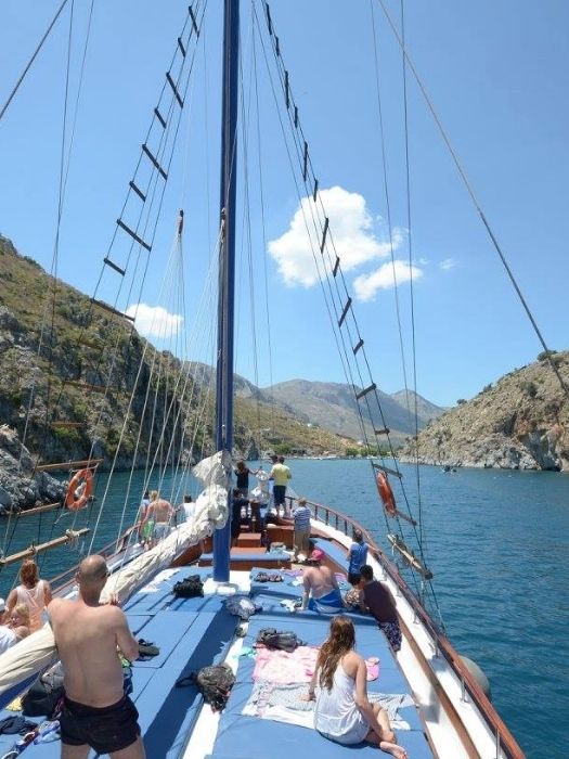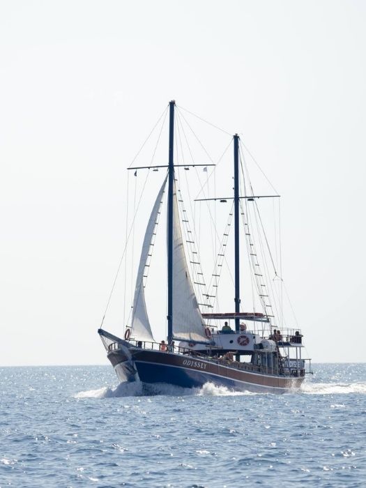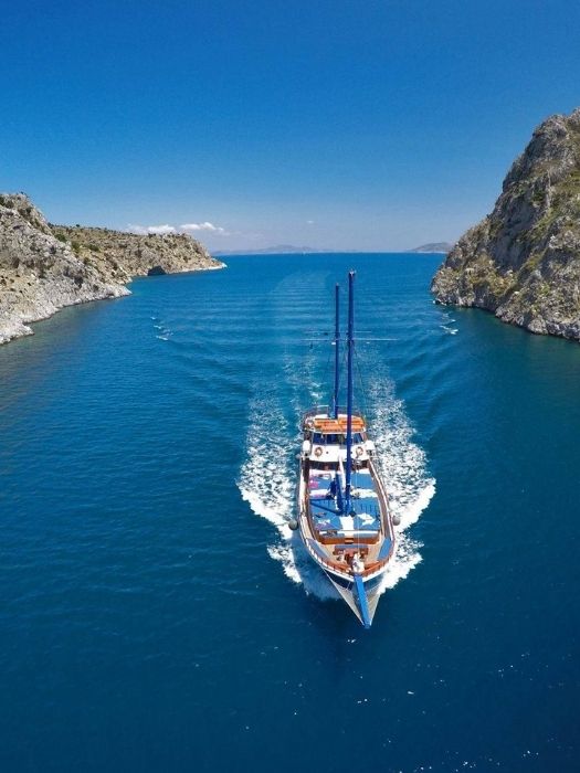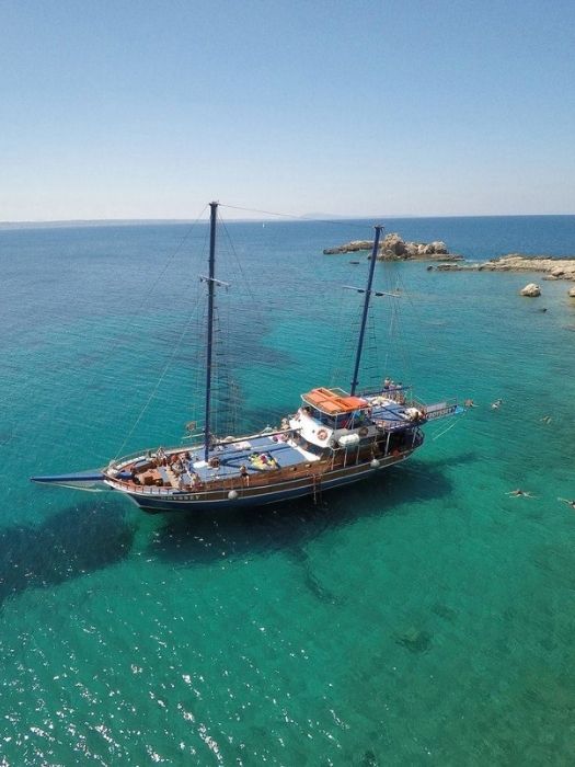 The Three Islands vessel is a comfortable wooden yacht with two decks, featuring numerous sun loungers, shaded seating areas, a kitchen, a well-stocked bar, and restroom facilities, ensuring your comfort throughout the journey.