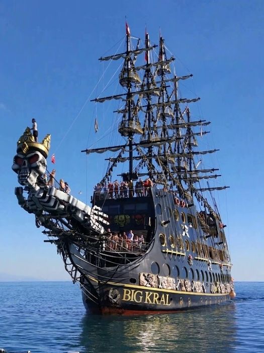 Alanya Big Kral boat trip is an 8-hour voyage on a big pirate ship with animations and foam party across the waters of the Mediterranean Sea. You have undoubtedly seen many ships and yachts cruising the sea of Alanya. However, Big Kral stands out from the others. It is a very stylish, huge ship that looks like a 17th-century galleon.