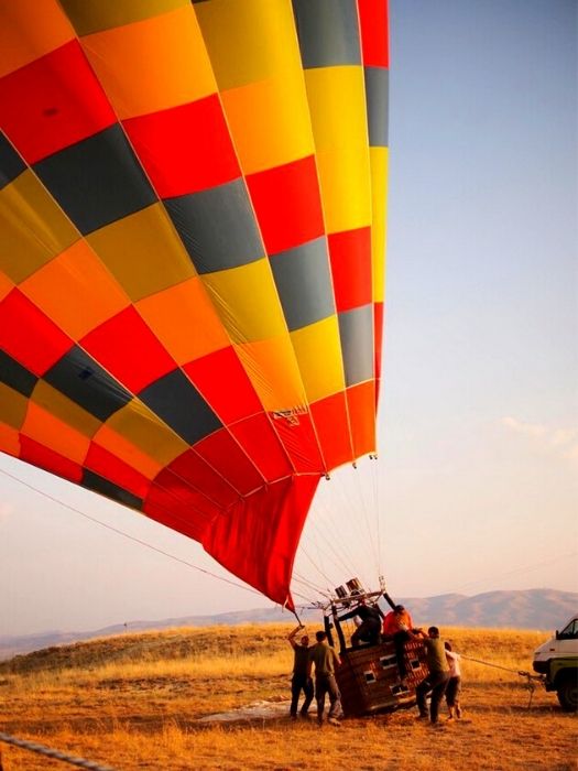 Once you are picked up from your accomodation by the transfer team you will be brought to the base site at the edge of Pamukkale town to watch the balloons being filled.  This magical sight will take place as the sun begins to rise and once your balloon is ready you will be escorted to your balloon and given a brief safety talk about your flight.  At this point you will be able to witness the filling of the balloon and marvel at its sheer size.