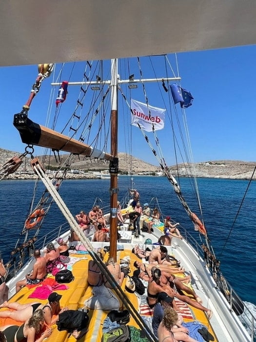 Santa Maria 3-island cruise is a 7.5-hour lazy day boat trip to Kalymnos, Plati, and Pserimos with multiple swim breaks during the day.