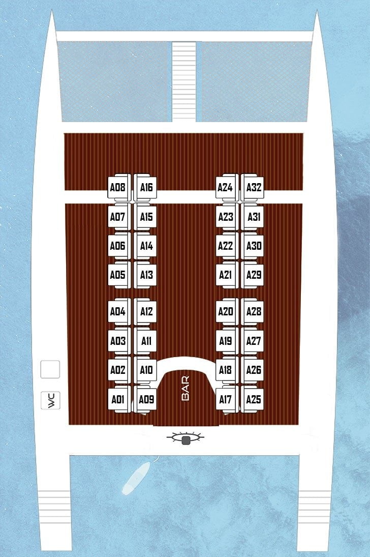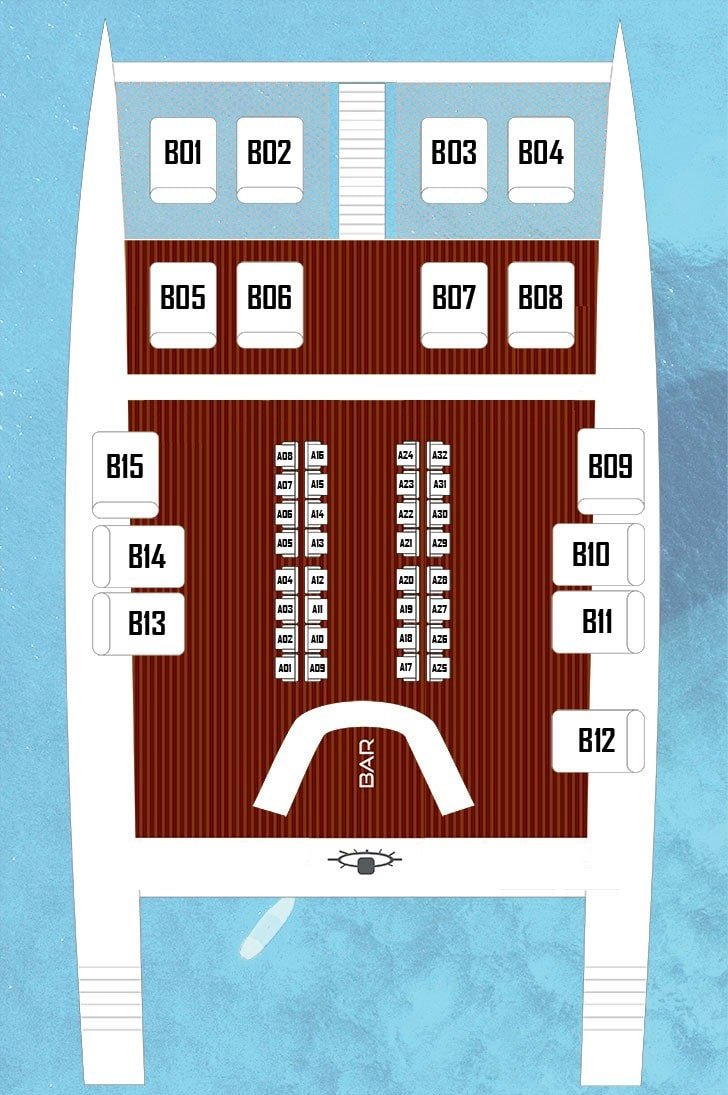 Catamaran has 32 seats and 15 Balinese beds, providing a premium treat for up to 62 people. You will enjoy ample space and comfort on your journey.